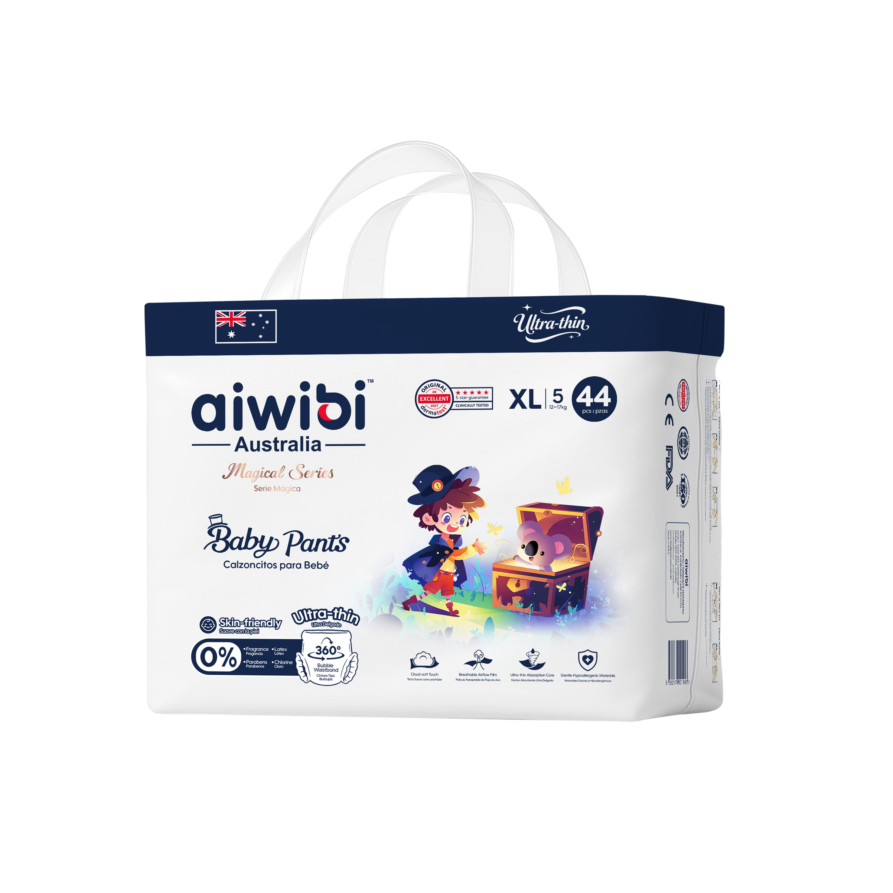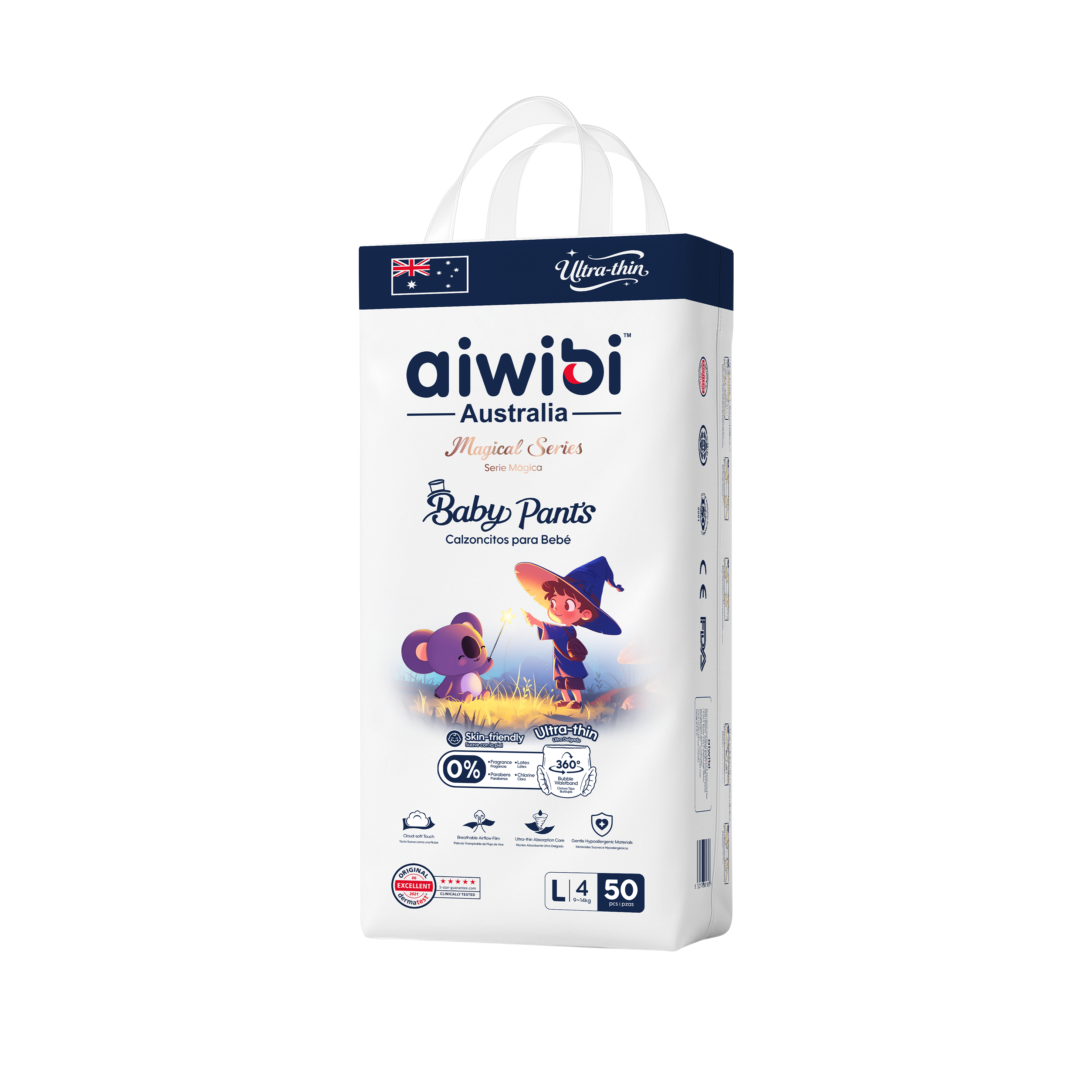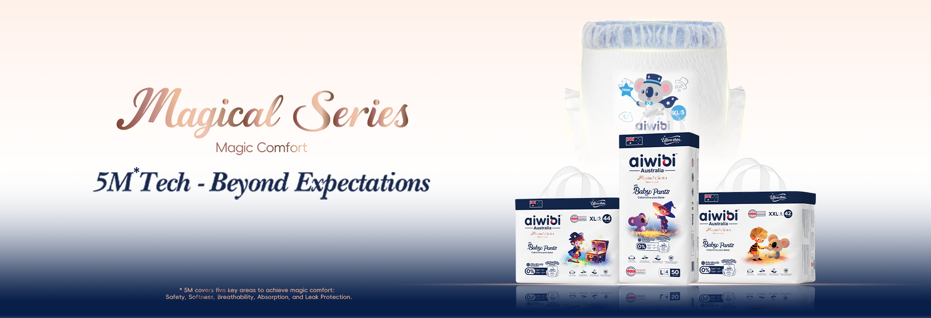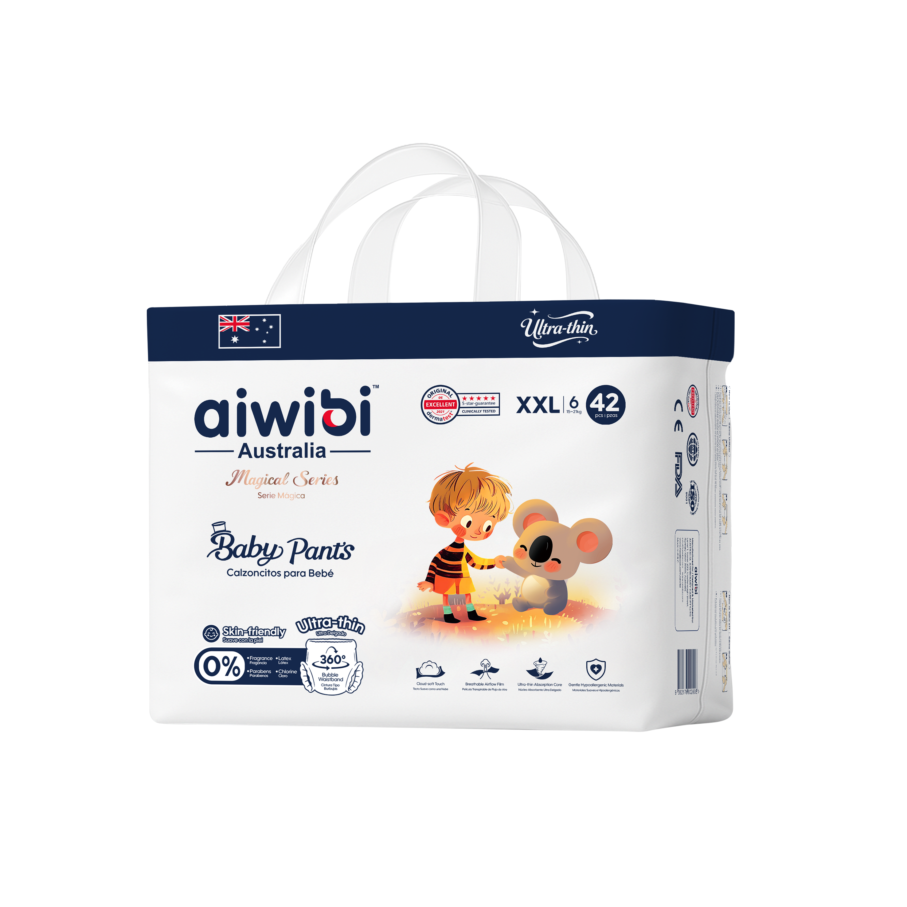 Choose our Plant-based Pants for an eco-friendly option that doesn't compromise on performance. Crafted with FSC-certified natural wood pulp, the PlantPower Absorbent Core™ delivers rapid liquid dispersal and outstanding absorbency. The breathable MicroAiry™ Film and innovative 360° Comfort Fit Waistband™ ensure maximum comfort and airflow, while the 3D Pearl Pattern Topsheet reduces skin contact and friction.